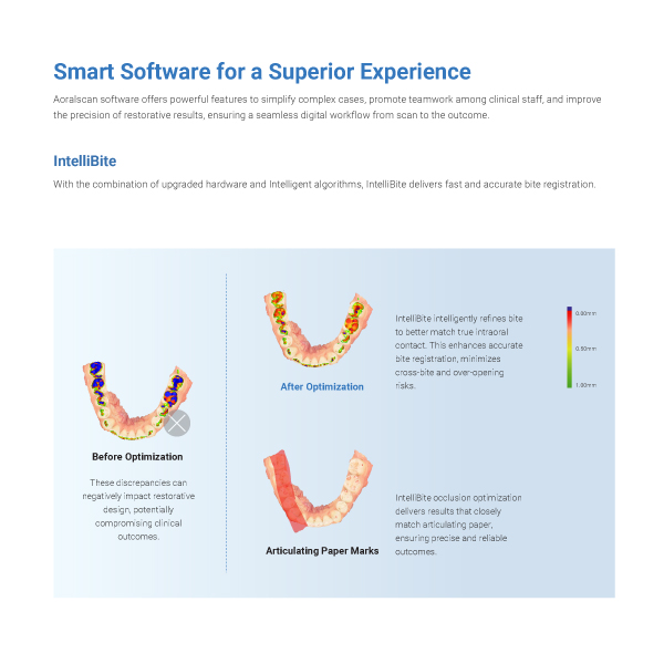 Say goodbye to manual bite adjustments and articulating paper. IntelliBite, exclusive to the Aoralscan Elf and Elite series, uses advanced AI and 3D intelligent reconstruction to automatically detect real occlusal contact distribution and deliver perfectly accurate bite registration every time.